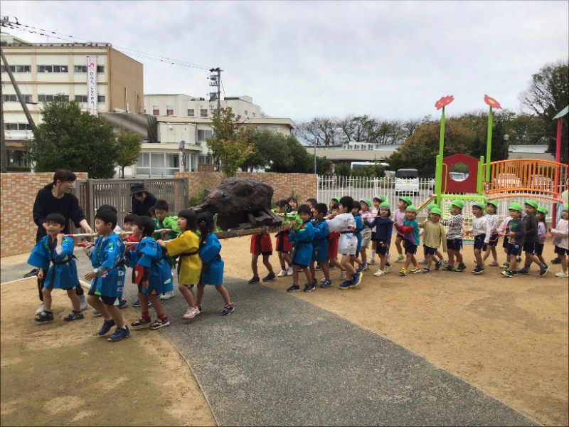 今年の秋まつりのテーマは『じんあい万博』でした。年長児を中心に日本・韓国・インド・イタリア・フランス・アメリカの6か国を選び、まずは、その国の国旗や挨拶を調べ、「万博作り」が9月末から始まりました。年中児や年少児も加わり、縦割りの3グループに分かれました。食べ物や民族衣装、踊りなどを調べ、お寿司・インドカレー・サムギョプサル・チマチョゴリを作ったり、民族衣装を着てフラダンスを踊ったりと、それぞれの国に関心を深めながら準備を進めていました。その他に、未満児クラスのお友達とお店屋さんごっこの玩具やお花、カバン、ペンダントなども作りました。