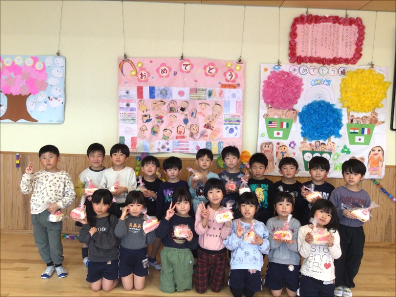 全園児が遊戯室に集まり卒園児を送る会を行いました。お参りお当番は年長児から引き継いで、ひばり組(年中児)が行い、始まりの言葉を告げました。つばめ組(年長)と各クラスが電車ごっこやわらべうた、野菜運びリレー、綱引きをして交流を楽しみました。ひばり組からは紙粘土で作ったケーキ型の貯金箱を一人一人プレゼントしました。卒園式は在園児が参加しない為、卒園児を送る会の中で、お祝いの言葉を掛け合ったり「ぼくときみのららら♬」を歌ったりして感謝とお祝いの気持ちを伝えました。壁には各クラスで作ったお祝いのメッセージボードも飾りました。送る会を開いてくれたお礼に、つばめ組(年長児)は「♪ドキドキドンの一年生」と「♪ともだちになるために」を歌いました。みんなの中で大きくなった姿が誇らしげでした。