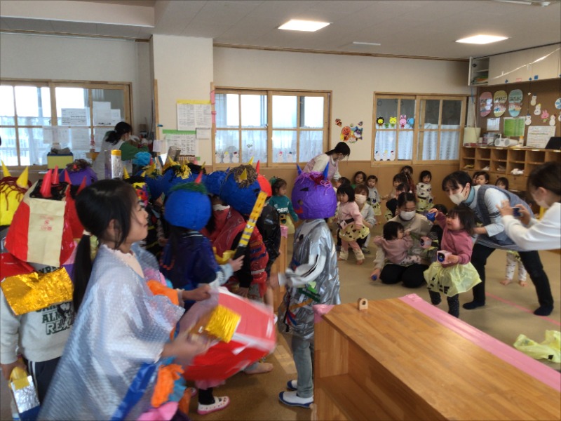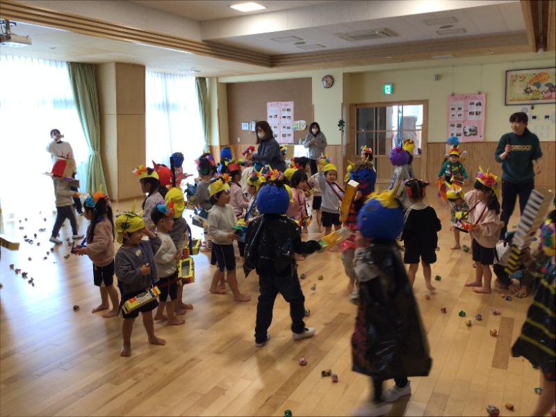 各自が工夫して作った豆入れや鬼のお面、衣装をつけて「豆まき会」を行いました。